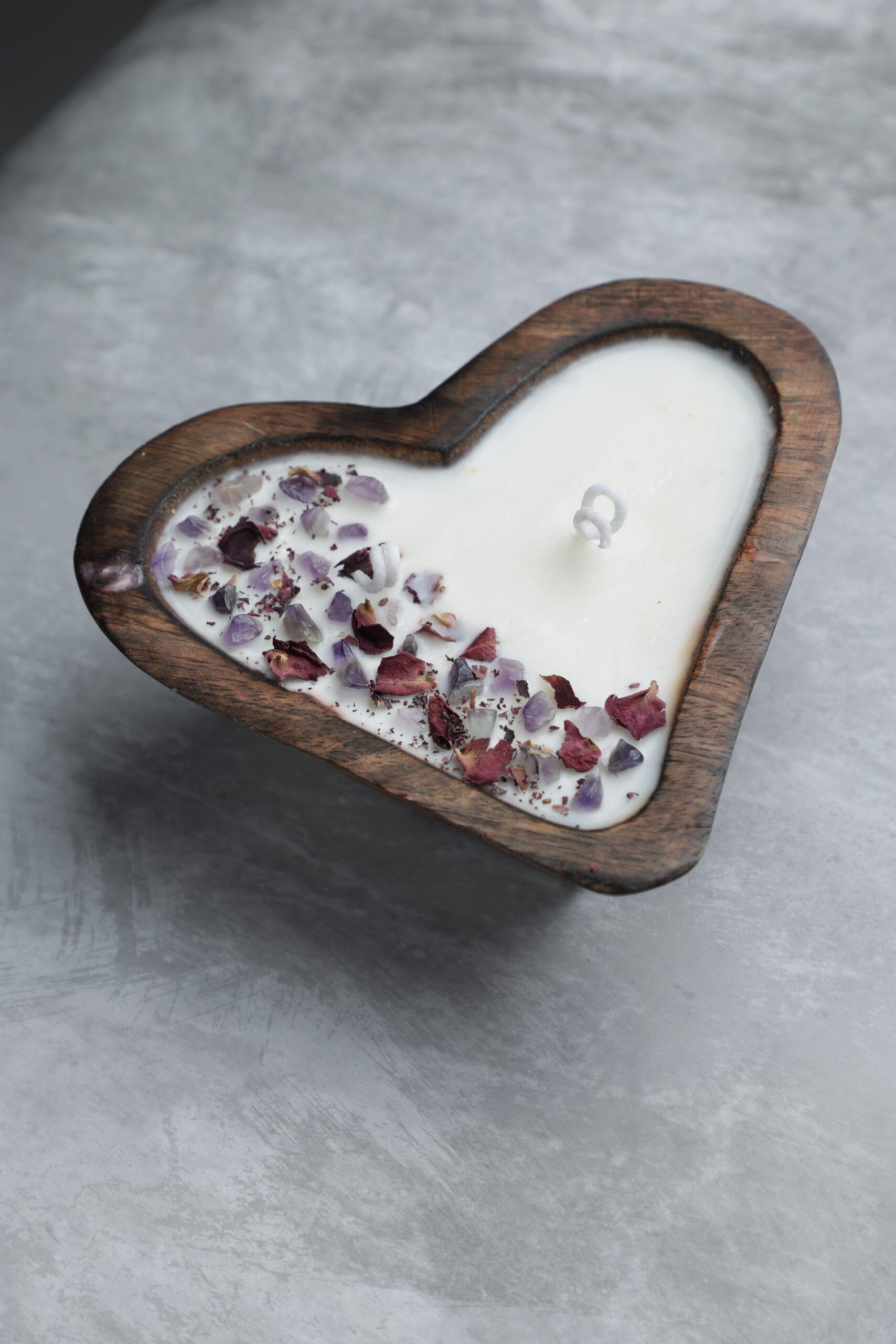 Hand-poured into a natural wooden heart-shaped bowl, this candle blends rustic charm with soft elegance. Finished with dried rose petals and crystal accents, each piece is unique—just like the love it represents.