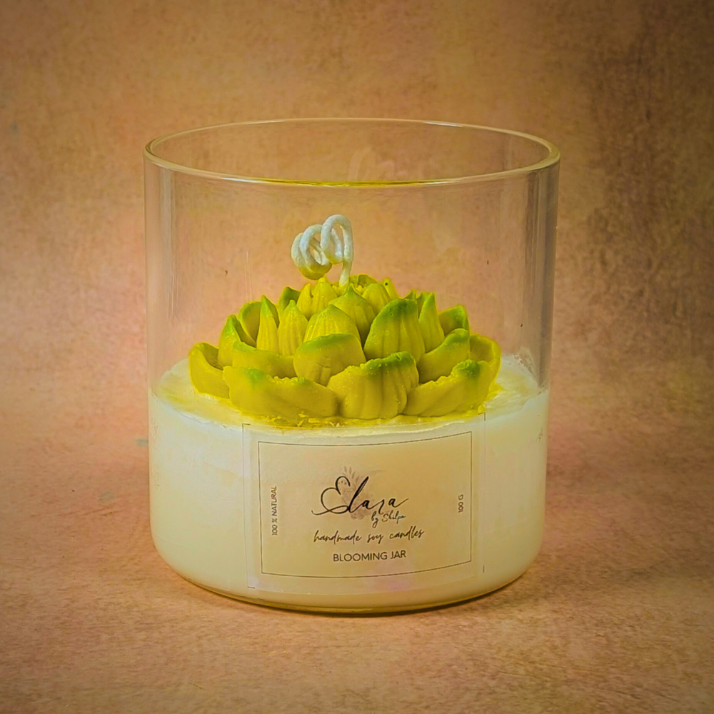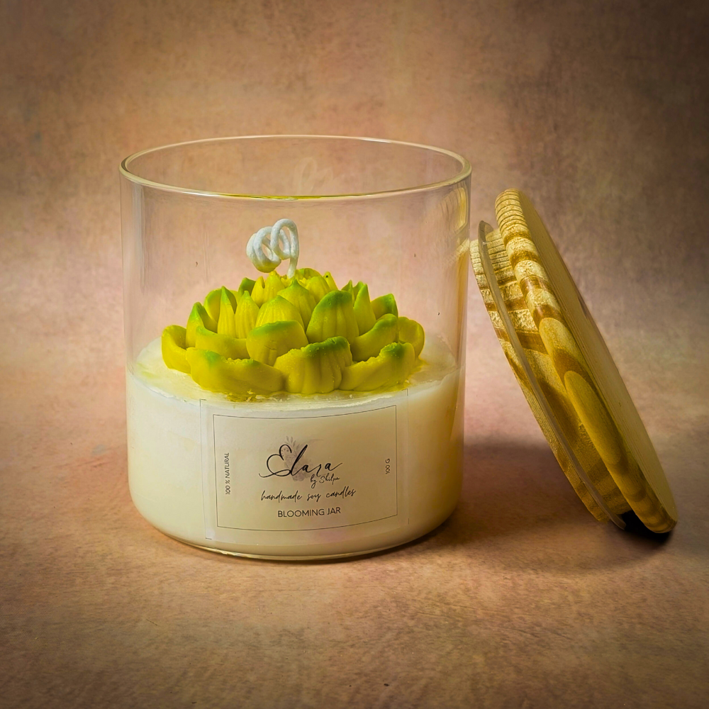 The Blooming Jar Candle is where minimal elegance meets handcrafted artistry. Housed in a sleek transparent glass jar with a rustic wooden lid, the candle features a delicately carved blooming flower in vibrant green tones, sitting atop creamy soy wax.