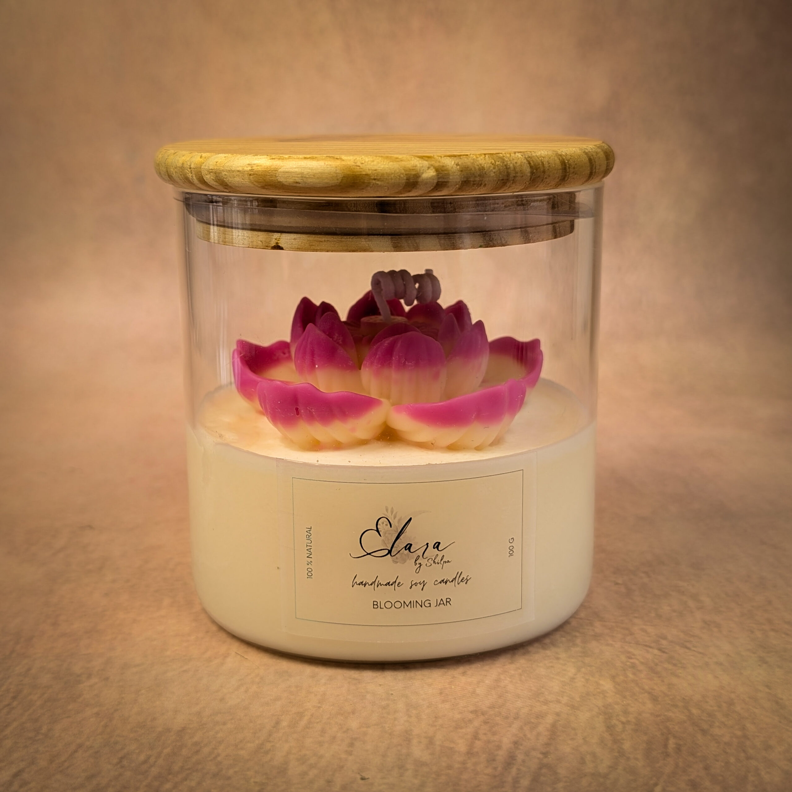 The Blooming Jar Candle – Cherry Blossom is designed to bring freshness and beauty into your living space. Each candle is carefully hand-poured with natural soy wax and decorated with a hand-sculpted flower centerpiece in shades of pink and ivory, creating the look of a blooming lotus.