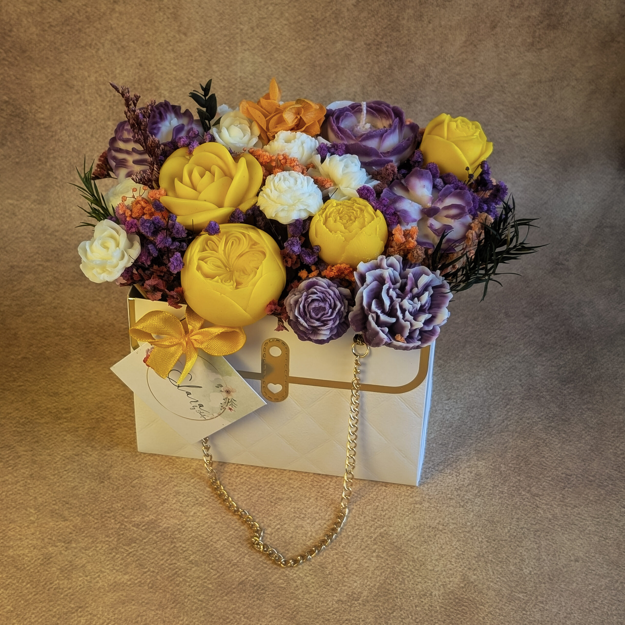 The Luxury Floral Handbag Candle – Golden Bloom Edition blends fashion and fragrance into one extraordinary creation. Hand-sculpted wax flowers — from yellow peonies to purple carnations and ivory roses — are carefully arranged to resemble a blooming handbag bouquet. Dried florals and foliage add natural depth, making the piece even more striking.