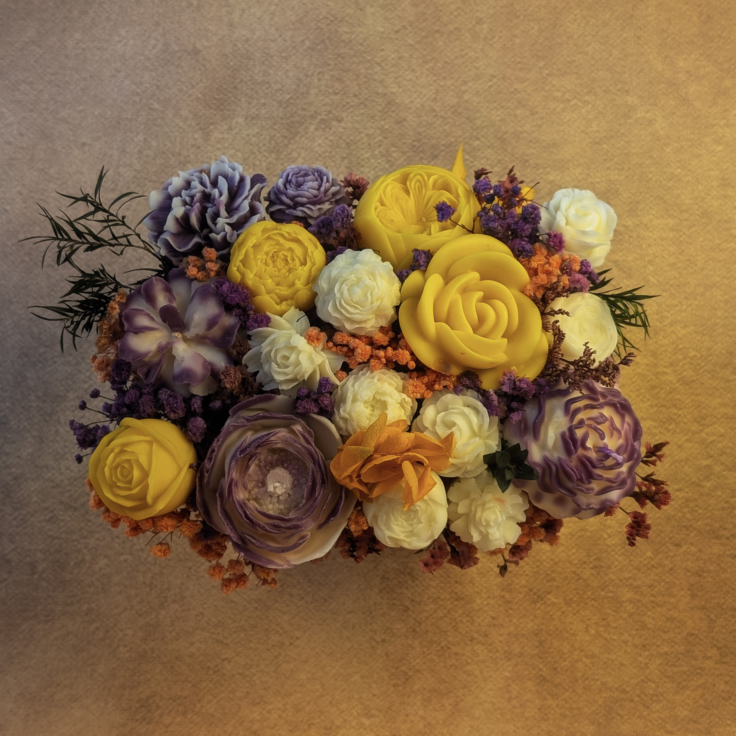 Handcrafted Wax Florals: Bold yellow, purple, orange, and ivory blooms with dried accents