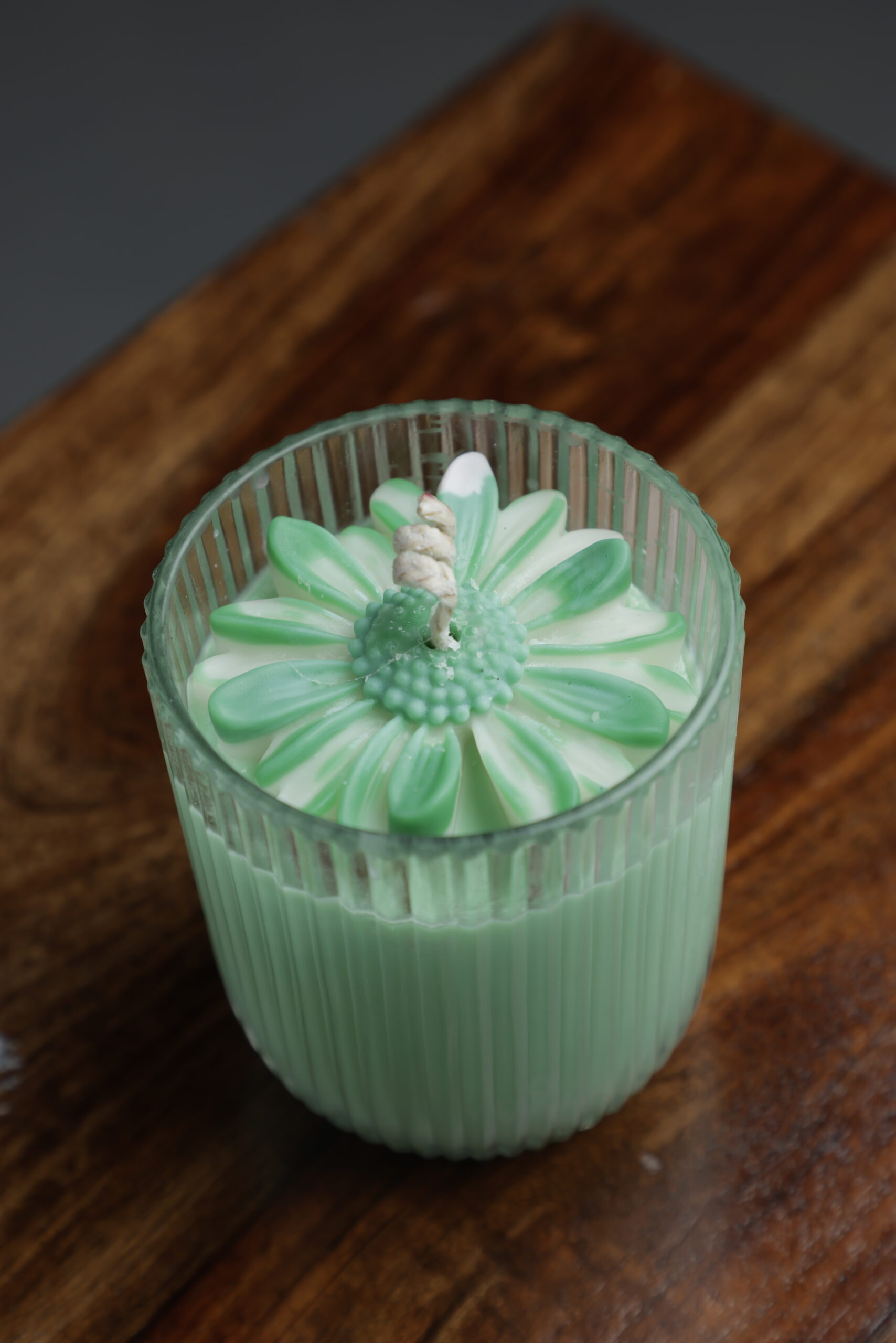 Mint Daisy Candle – Handcrafted Floral Candle in Ribbed Glass